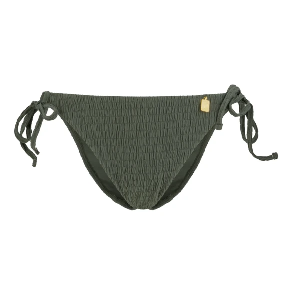 Die Smocky Bikini Hose mit seitlichen Bändern von Annadiva Swim ist in der Farbe Olive erhältlich. Auch in dieser Saison wieder dabei: der fein strukturierte Stoff, der alle Unebenheiten kaschiert. Do we need to say more!? Dies ist der ultimative Favorit von Ihnen und uns. Die Hose kann nach Belieben an der Seite gebunden werden und fällt tiefer auf den Hüften. Kombinieren Sie diese Bikini Hose mit einem der Oberteile von Smocky. Mentally at the beach!