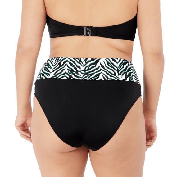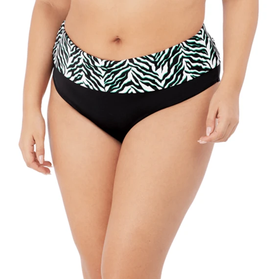 Die Zulu Rhythm Bikinihose mit Umschlag von Elomi Swim ist in der Farbe Black erhältlich. Diese Bikinihose kennzeichnet ein schöne Animalprint in einem sommerlichen Schwarz / Türkis-Farbon auf einem weißen Hintergrund. Der Umschlagsbund gibt Ihnen die Möglichkeit zu wählen, wie hoch Sie diese Bikinihose tragen möchten.